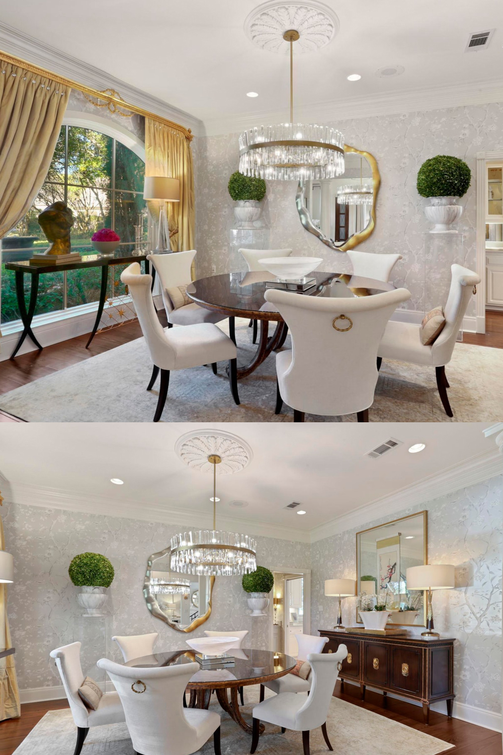 Dinner here feels like a treat, even if it’s just pizza night. The dining room is wrapped in pale wallpaper with a soft floral pattern. Gold curtains frame a huge arched window. There’s a round table with cushy, high-backed chairs, ready for long talks and laughter. A round crystal chandelier shines above. A gold-framed mirror and sculpted topiary trees bring a playful touch of Parisian flair.