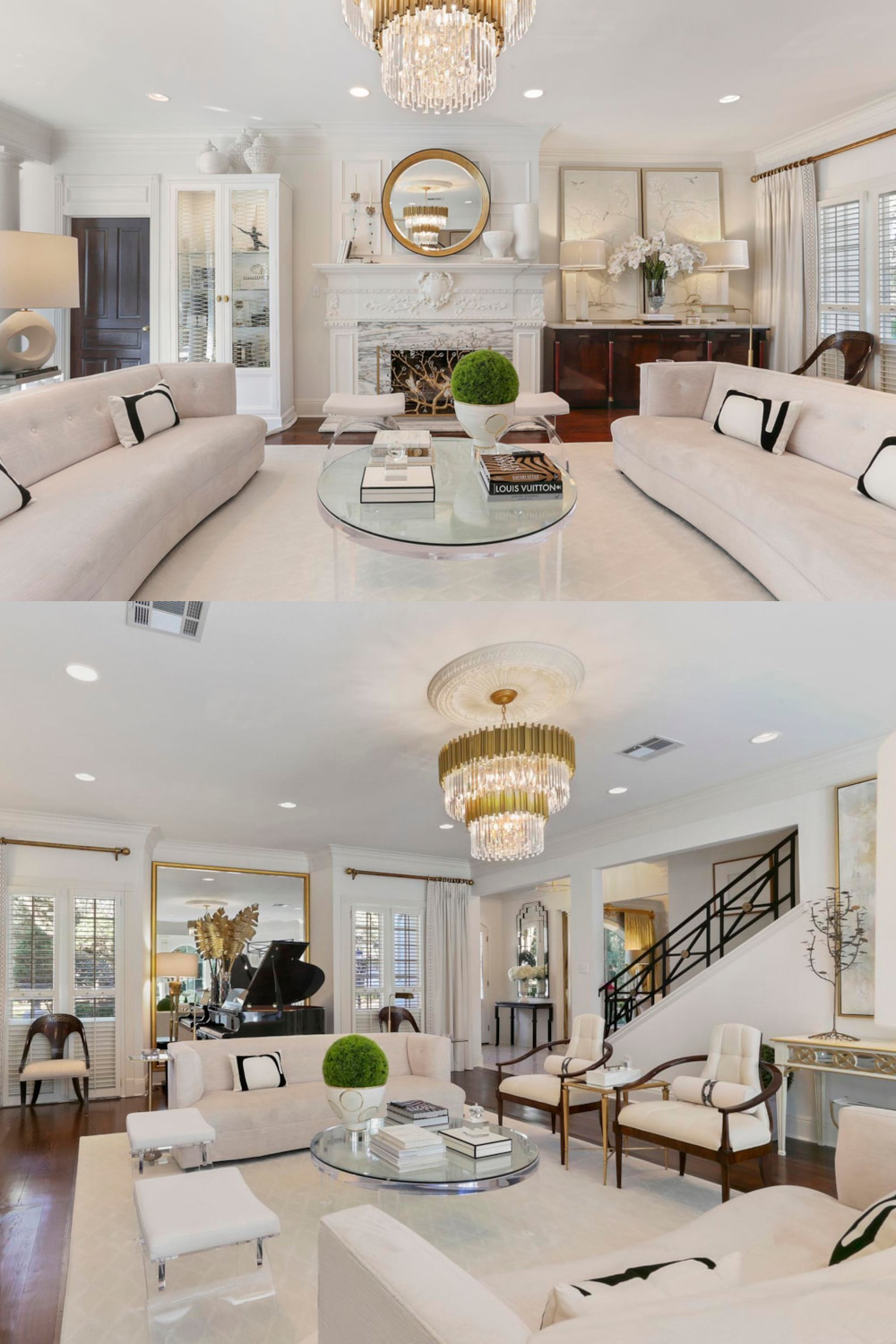 In the living room, creamy white sofas wrap around a glass table topped with art books and a potted green plant. Black and white pillows add a playful twist. There’s a grand fireplace with a carved white mantel and a shiny gold mirror above it. Crystal lights hang overhead, casting gentle patterns on the ceiling. Everything feels soft, comfortable, and a little bit fancy—but never stuffy.