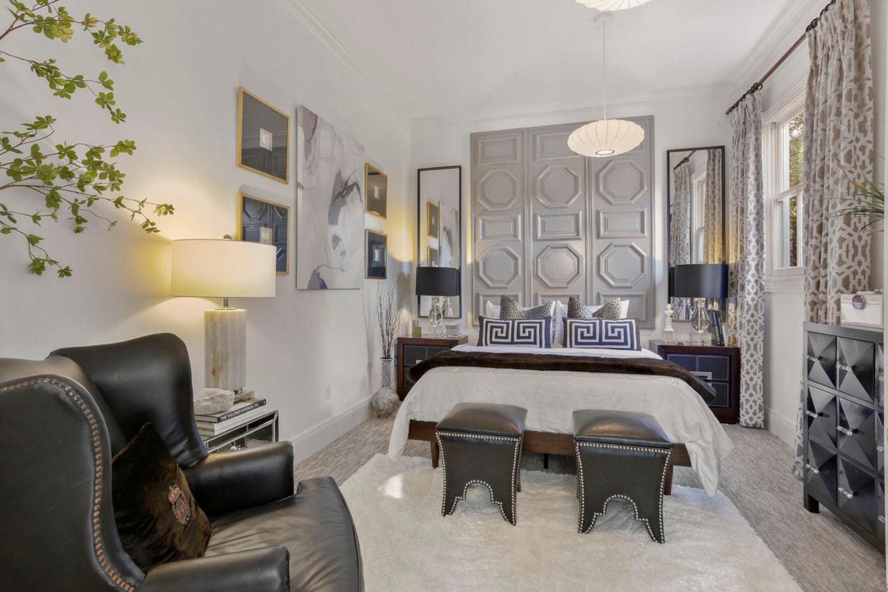 The main bedroom is all about rest. The bed sits against a dramatic paneled wall in pale gray. Tall mirrors stand on each side, making the room feel even bigger. Soft white linens and navy pillows with crisp lines feel both tidy and inviting. Nightstands with gleaming lamps frame the space, and a soft rug warms your toes. Tucked in the corner is a black leather chair, perfect for reading or just enjoying some quiet.