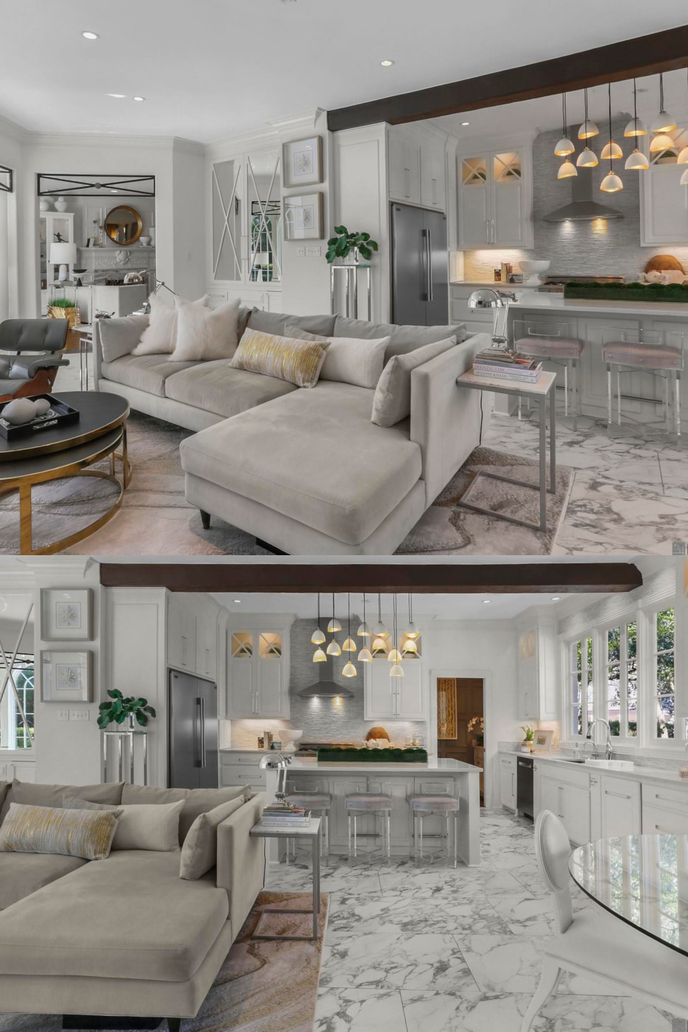 Look around and you’ll see what sets this home apart. Wide white moldings and tall doors frame each room. Smooth columns and arched walkways connect every space. Mirrors bounce the sunlight, making every corner feel open. The color palette stays soft—white, cream, and pale gray—while bits of gold and black keep things lively. Fresh flowers, green plants, and a few bold art pieces bring life and color, but nothing feels crowded.