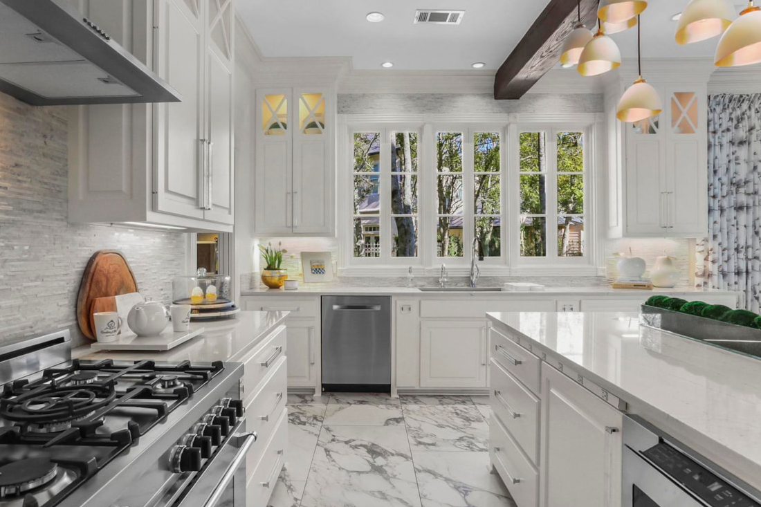 Cooking is easy when your kitchen looks this good. Everything is white—cabinets, counters, and even the shiny floor. Marble stretches across the island and backsplash, while soft lights dangle from a rustic wood beam overhead. There’s a huge range, a deep sink, and plenty of counter space for rolling out cookies or prepping dinner. Glass-front cabinets and pops of greenery give it a clean, modern vibe. Pull up a clear stool at the island for breakfast, homework, or coffee with friends.