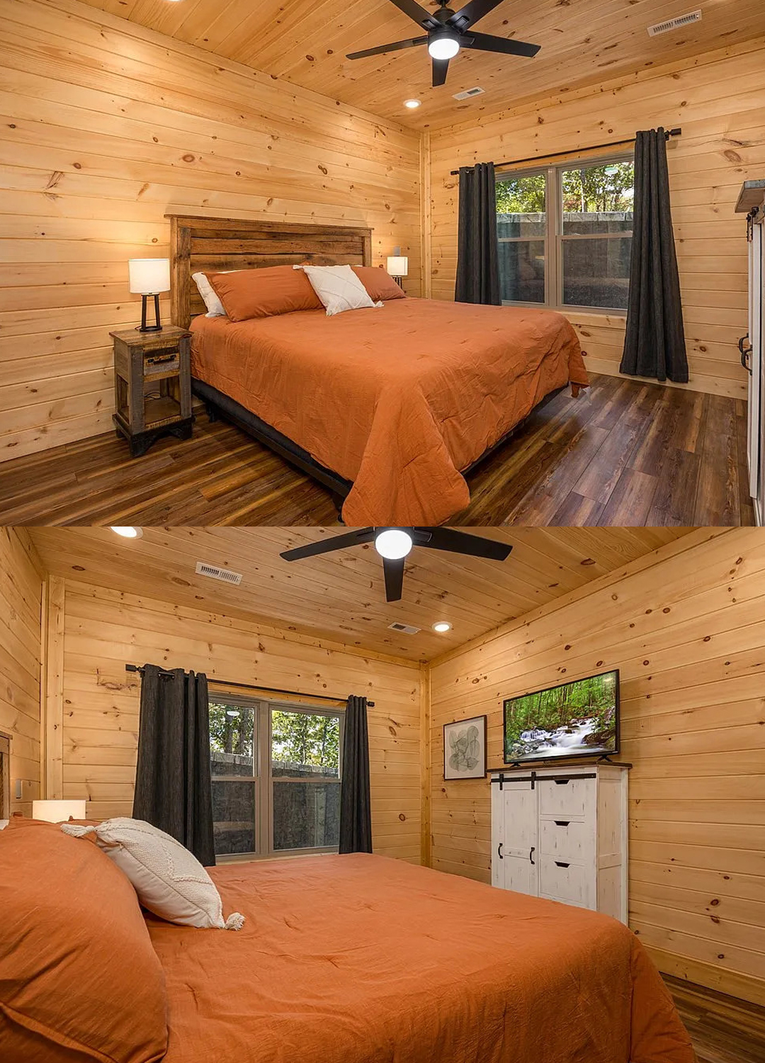 When it’s time to sleep, the bedroom offers peace and quiet. The knotty pine walls continue here, wrapping you in a soft glow. The bed is big and cozy, dressed in deep orange sheets that remind you of autumn leaves.
