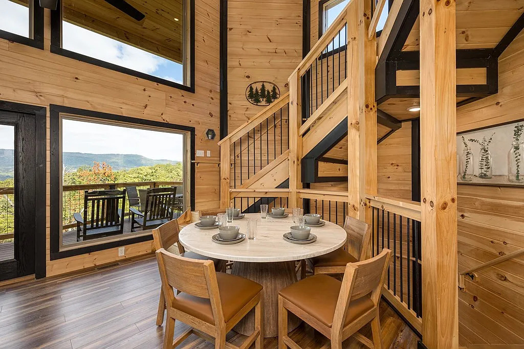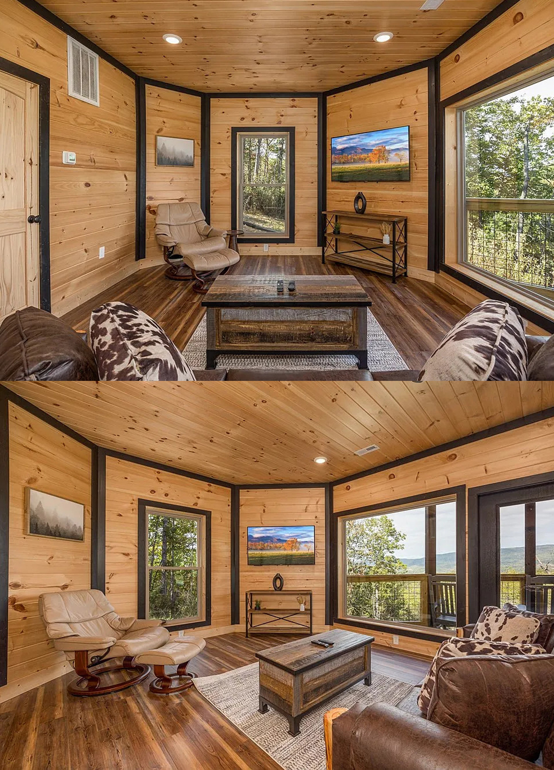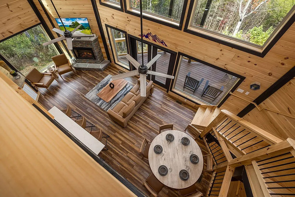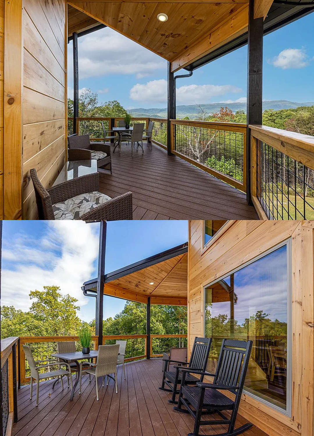 Mountain living is all about enjoying nature. This cabin makes that easy. Each deck is made with durable wood planks, so it feels solid under your feet. There are comfy chairs and tables set up for relaxing, reading, or sipping coffee as the sun rises.