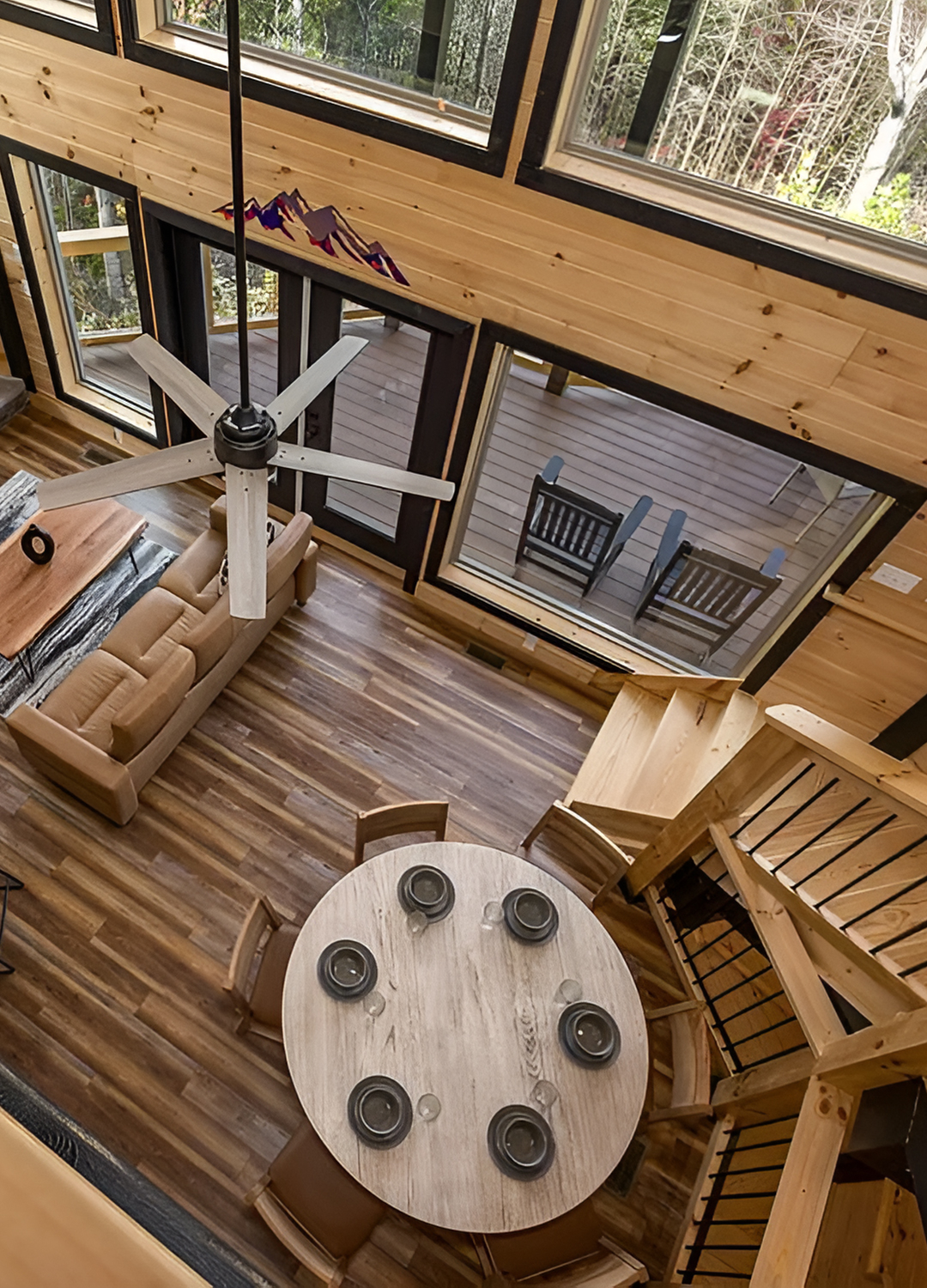 Above the dining and living area, you’ll spot the loft. It adds extra space and gives a fun view of the cabin from above. Kids and guests will love this spot—it feels a bit like a treehouse, tucked up high and open to everything below.