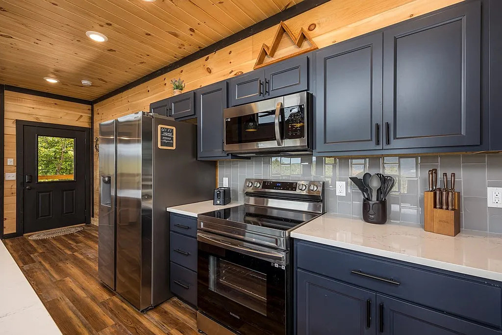The kitchen is where the magic happens, and this one is ready for anything. Blue cabinets line the walls, giving a pop of color without feeling too bold. They go perfectly with the white countertops, which are bright, shiny, and easy to clean.