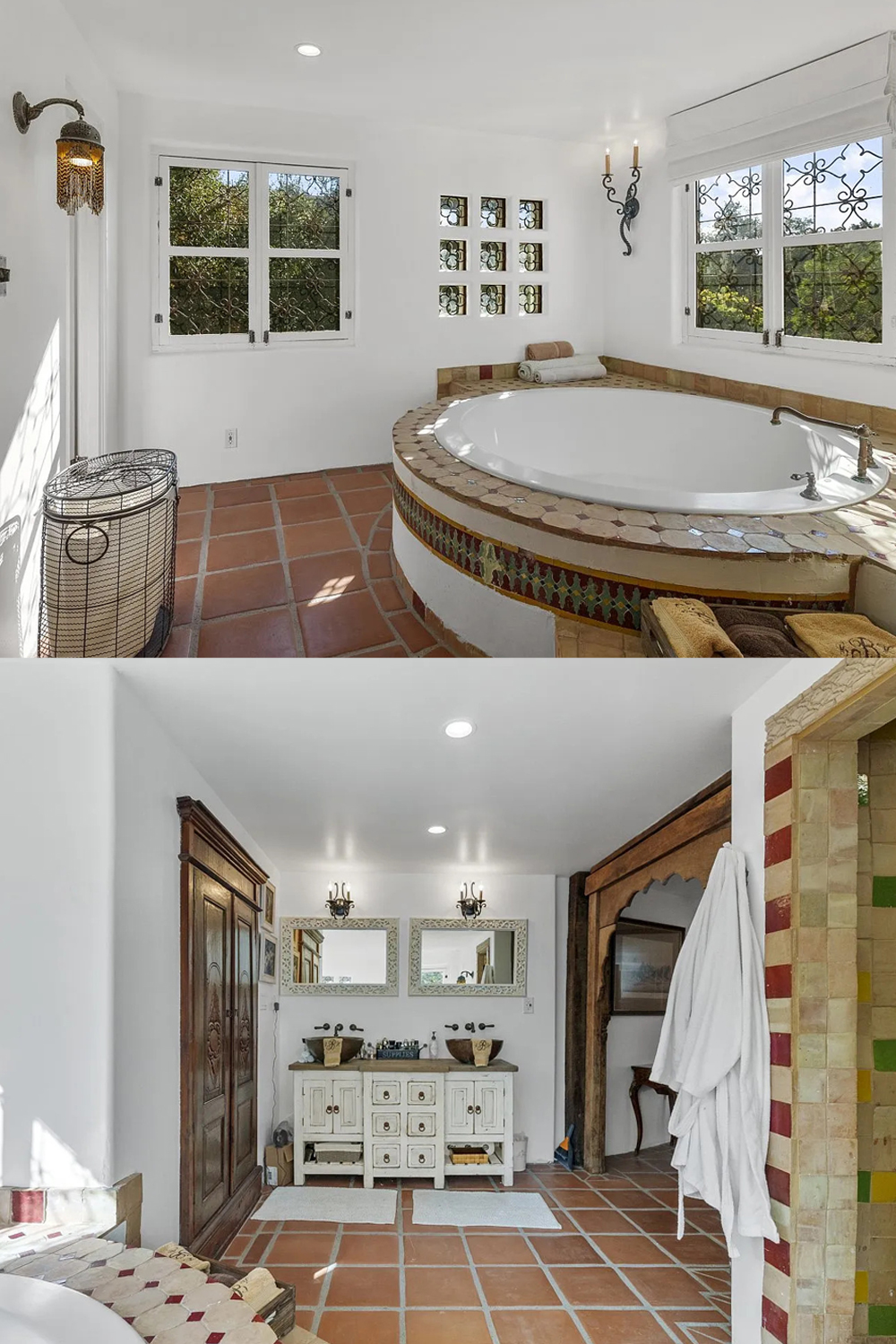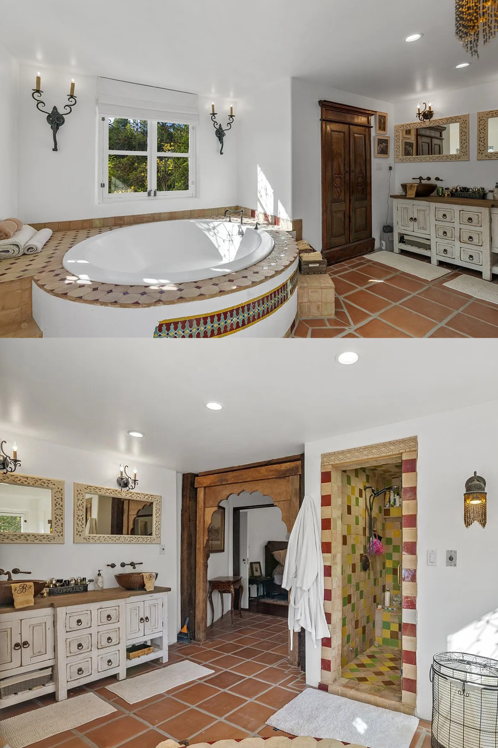 In the bathroom, you find pure calm. The tub is deep, round, and set into a tiled platform. The tiles are a mix of earth tones and bright patterns. Candles and wrought iron sconces line the wall, ready for a relaxing soak.