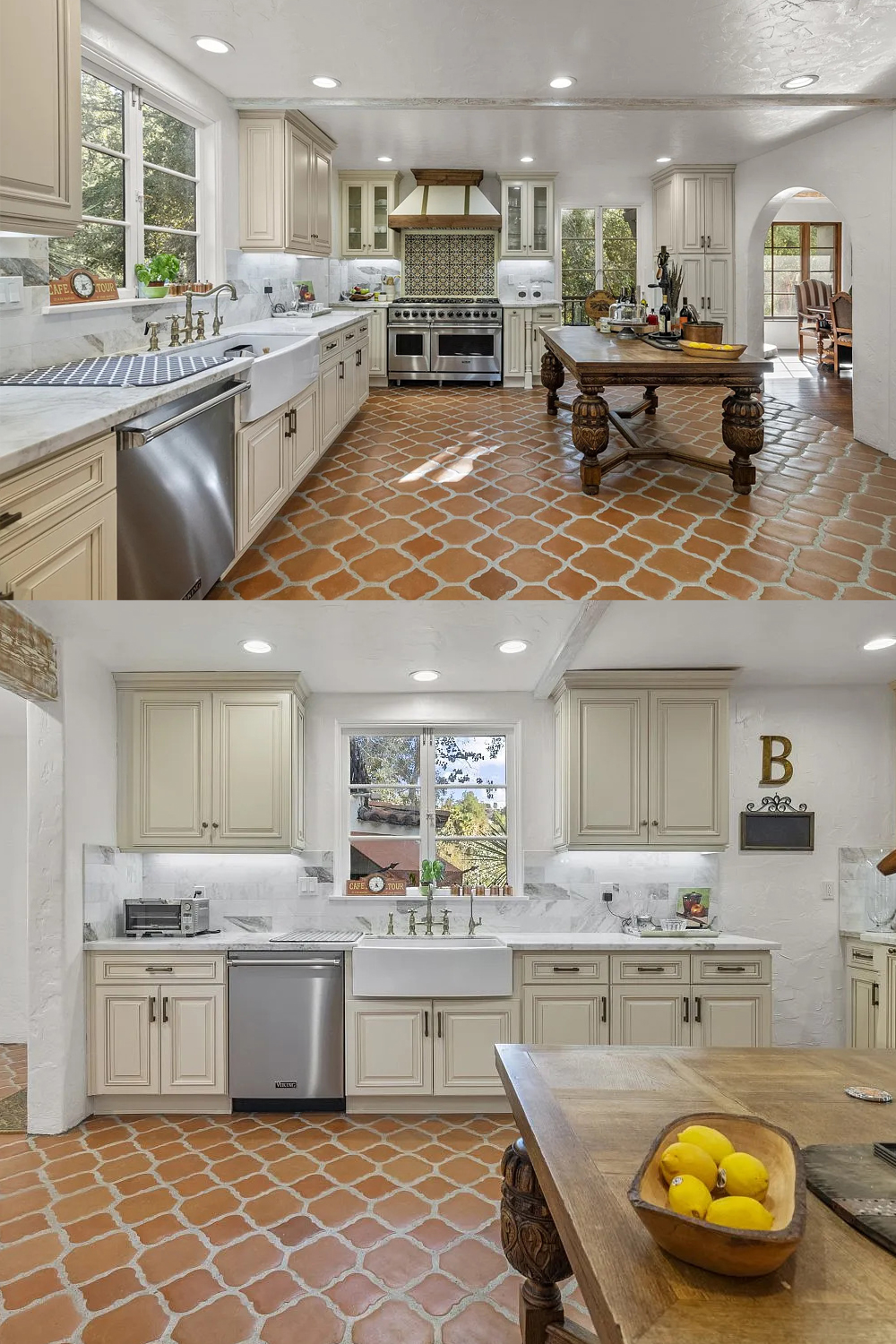 Now for the kitchen—a true star. The floor is terracotta tile, easy on the feet and always warm. Creamy cabinets line the walls, offering lots of space for pots, pans, and secret treats. The farmhouse sink is huge and white, set under a wide window. You can do dishes while you watch birds and trees outside.