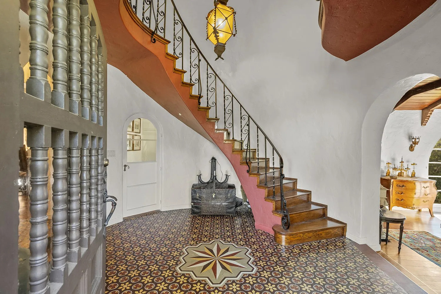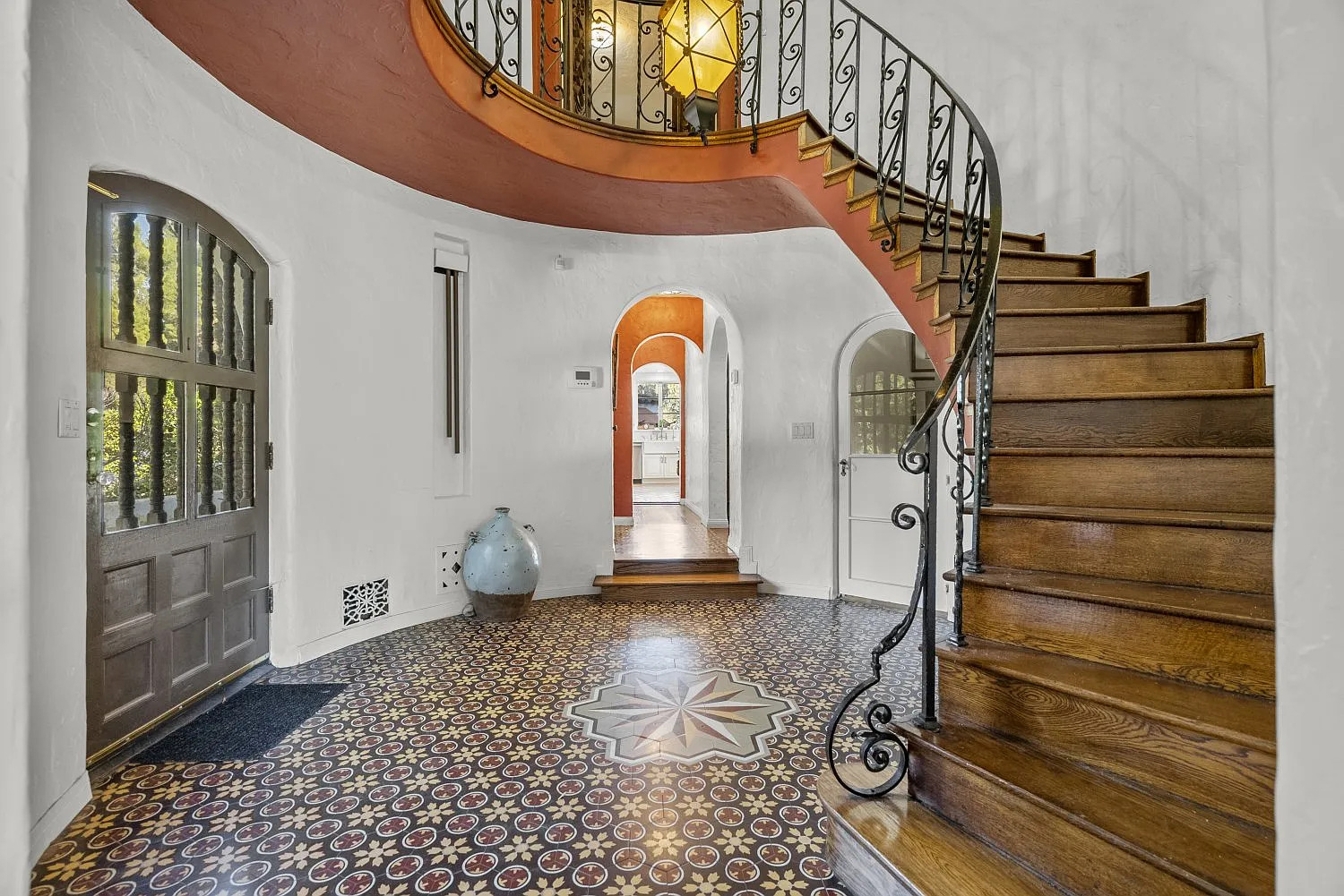 Open the door, and you’re greeted by a round, bright foyer. The floor is a work of art—patterned tiles in deep reds, browns, and creams. A starburst design marks the center. It’s the kind of detail that makes you want to pause and take it all in.