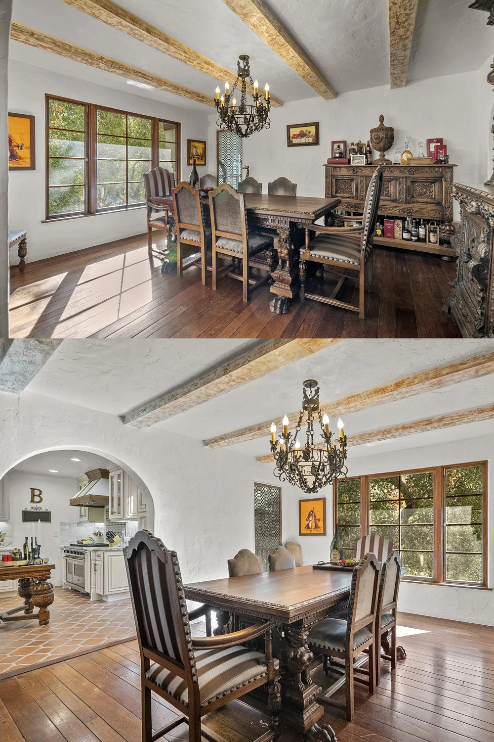 A wrought iron chandelier hangs from the ceiling beams. The light it gives is warm and golden—perfect for long dinners and happy toasts. The walls hold more art, mostly still-lifes and scenes of old Spain.