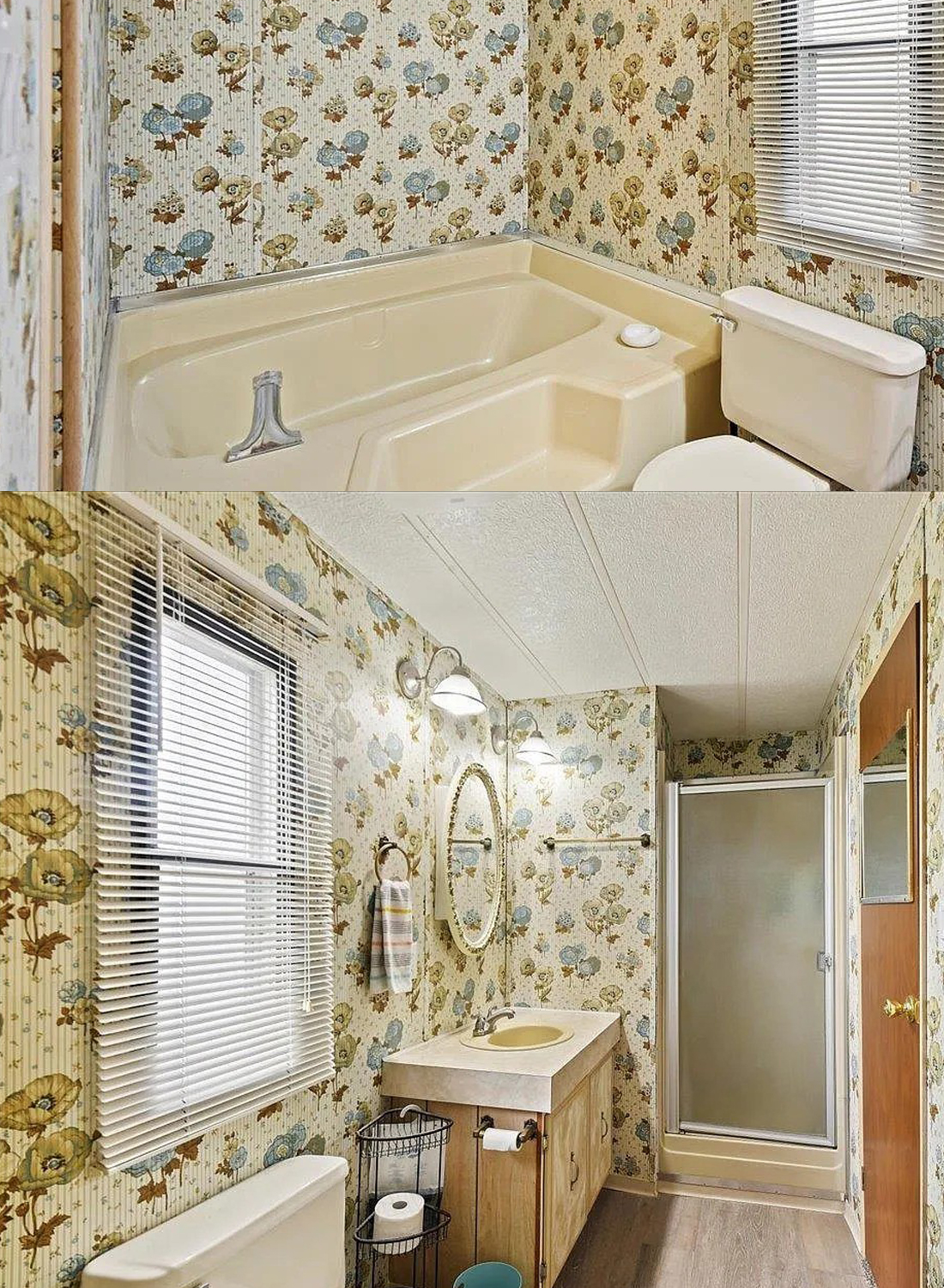 This bathroom is a real throwback—and that’s what makes it fun! The walls are covered in bold floral wallpaper, full of yellow and blue flowers. The vanity has a creamy yellow sink and a wood base that matches the cabinets in the kitchen.