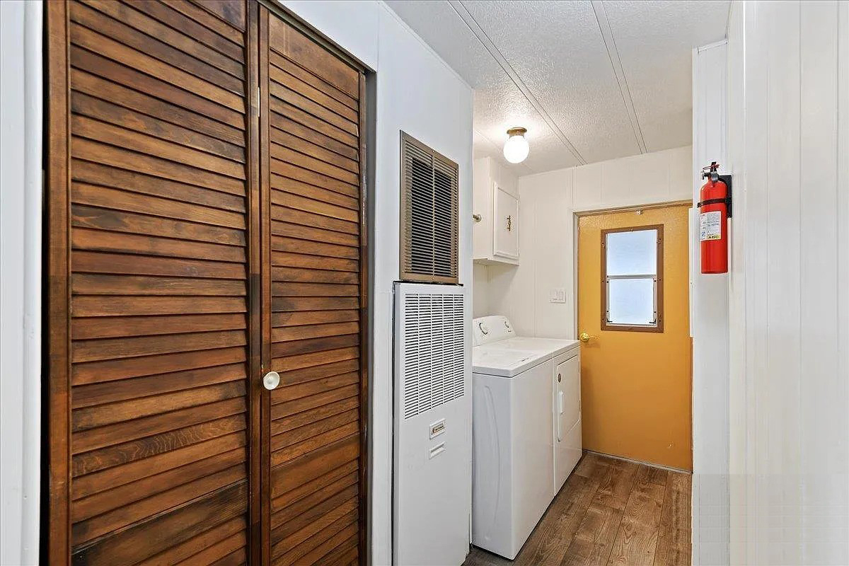 Across from the machines, wood louvered doors hide the utility closet. This keeps the hallway looking neat and tidy. It’s a practical spot that does its job without getting in the way.