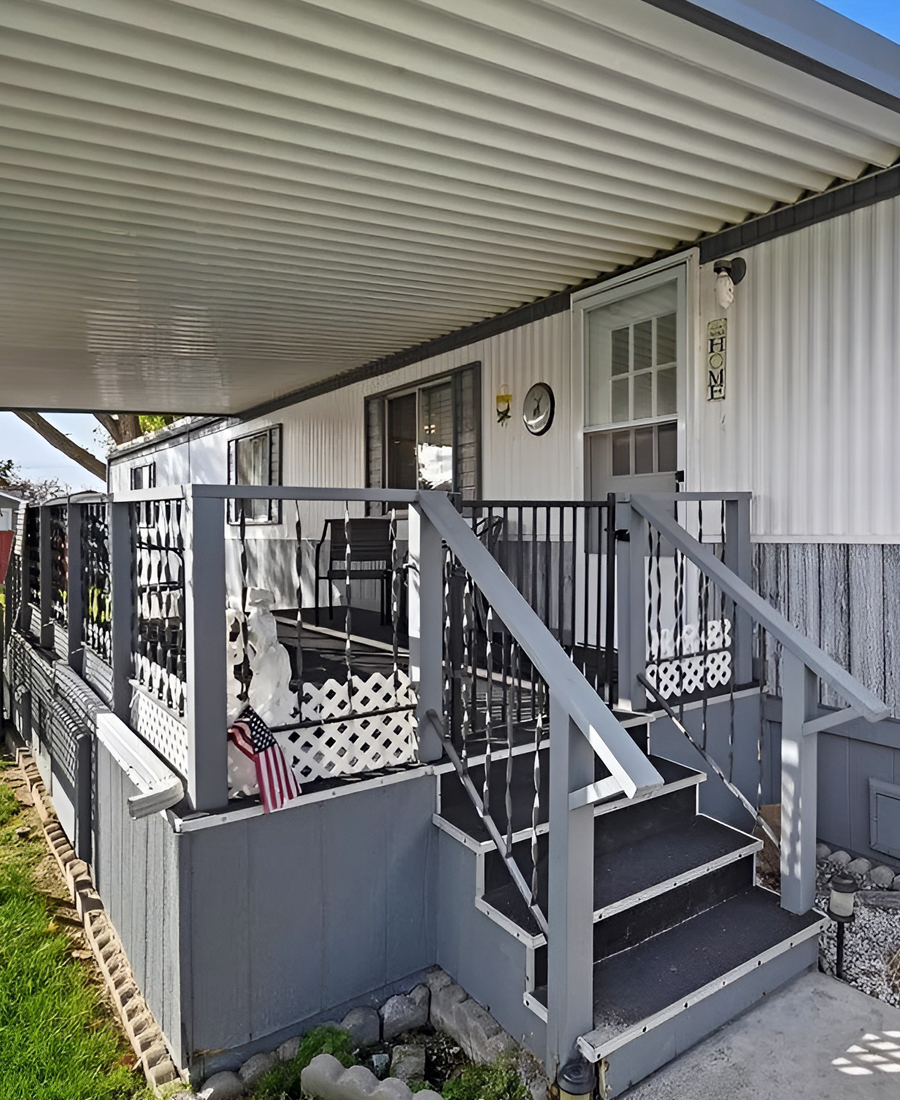 The first thing you notice is how inviting the outside looks. This home has crisp white siding on top with gray trim and lower panels. That color combo feels calm and clean. The porch is covered, so you can sit outside even if it rains. Black metal railings and white lattice below give it some retro flair. The porch steps are easy to climb and wide enough for a friendly welcome mat.