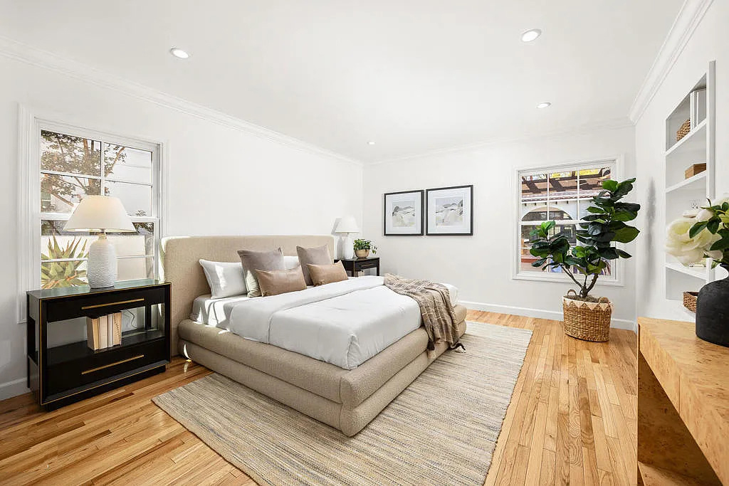 The main bedroom is all about peace and quiet. Light pours in from two big windows. Soft colors like beige, white, and pale wood create a restful space.