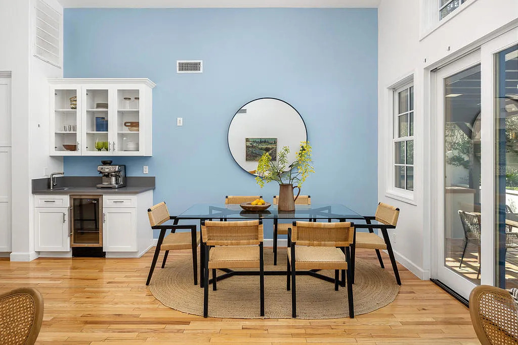 Next up is the dining room. One wall is painted a gentle blue, which feels fresh and cheerful. A large round mirror bounces even more light around.