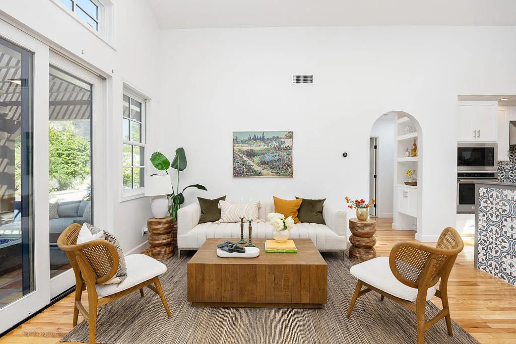 This home has another living space, perfect for hanging out. Soft sofas, a textured rug, and wood tables make the room feel welcoming. Built-in shelves, arched windows, and a round mirror give a little Spanish flair.