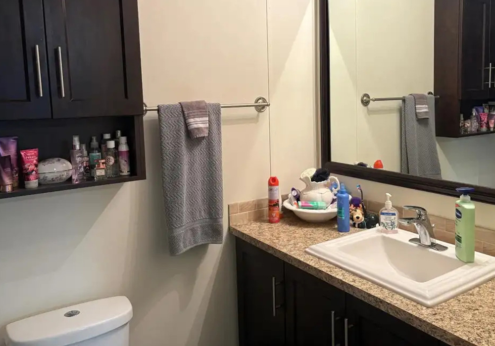 The bathroom is simple and neat. The same dark cabinets from the kitchen give it a pulled-together look. There’s a wide counter with a big mirror, so you have lots of space for getting ready.