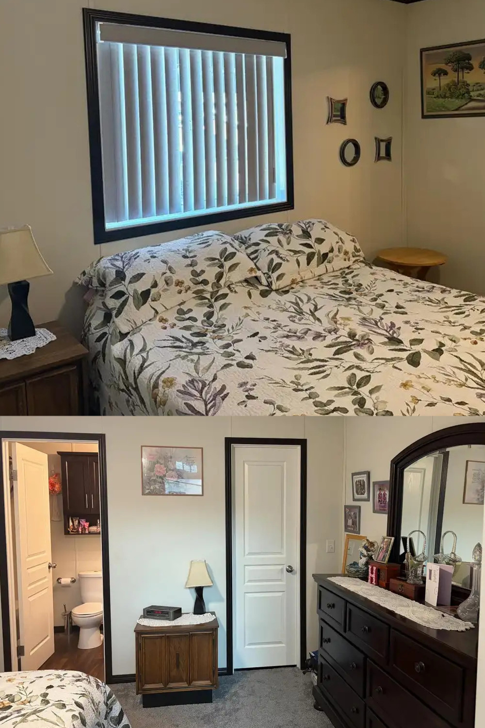 Walk into the bedroom and you’ll feel calm. The bed has a pretty floral quilt, and the window has blinds to let in as much (or as little) light as you want. There’s space for a lamp and a small nightstand. Art on the walls makes the room feel personal.