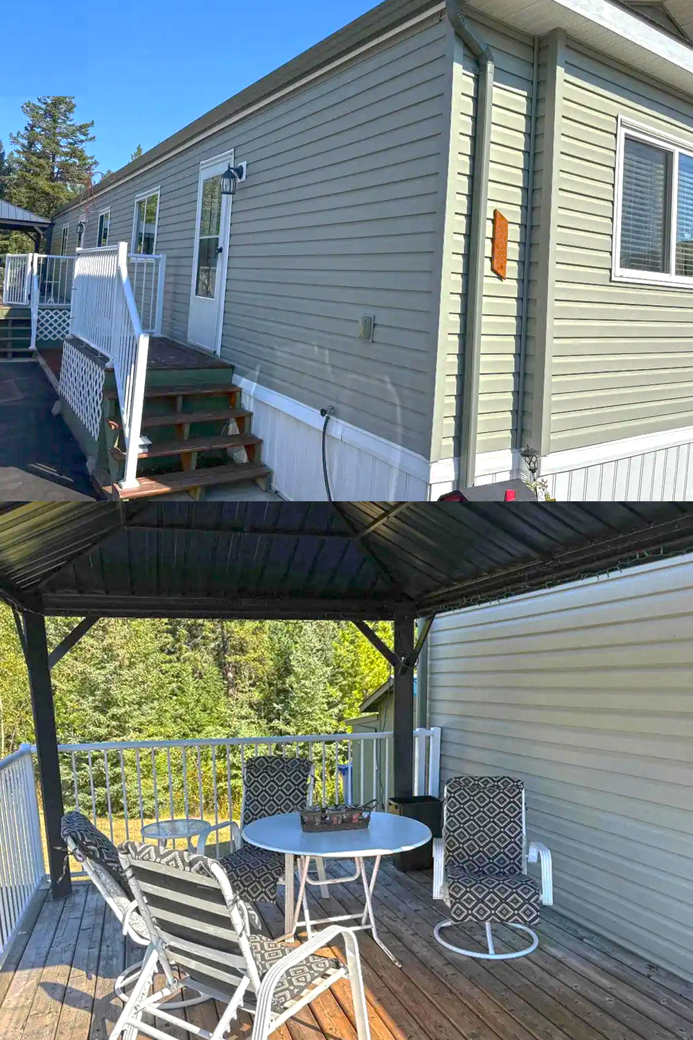 The outside of this home looks clean and inviting. The soft green siding feels calm and blends in with the trees. Bright white trim makes the windows pop. There’s neat white skirting along the bottom, which keeps everything looking sharp.