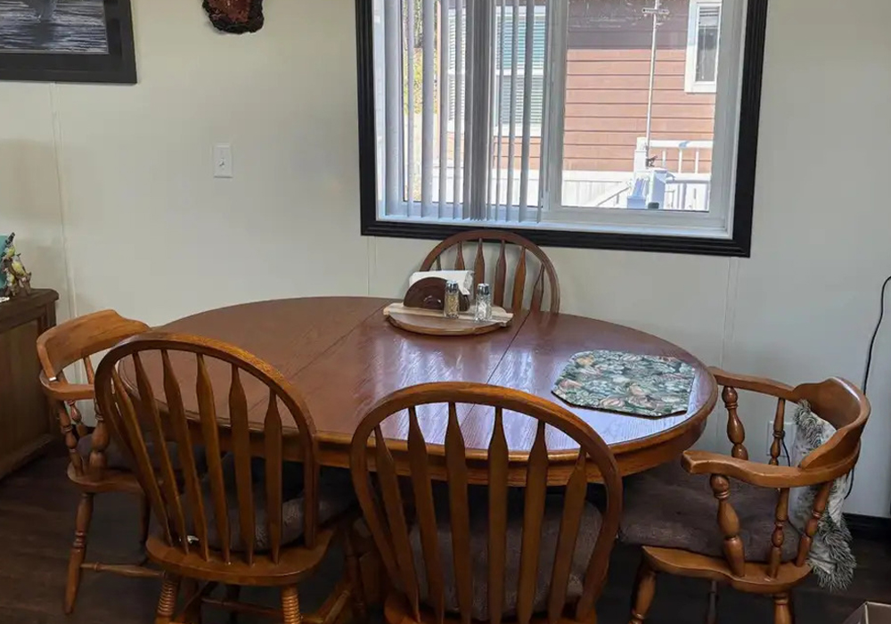 The dining area sits right by the kitchen. There’s a round wood table and four sturdy chairs. Overhead, a crystal-style light fixture adds a little sparkle. The window lets in even more light, making this a great spot for meals, games, or just hanging out.