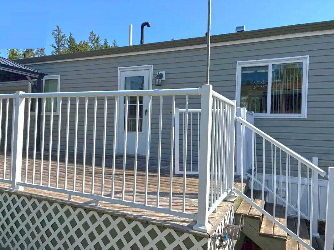 Step out back and you’ll find a big wooden deck. It’s a perfect spot to relax, eat, or read a book. A black metal gazebo covers part of the deck, so you can stay cool even on hot days. The deck has a strong white railing. It keeps you safe without blocking the view.